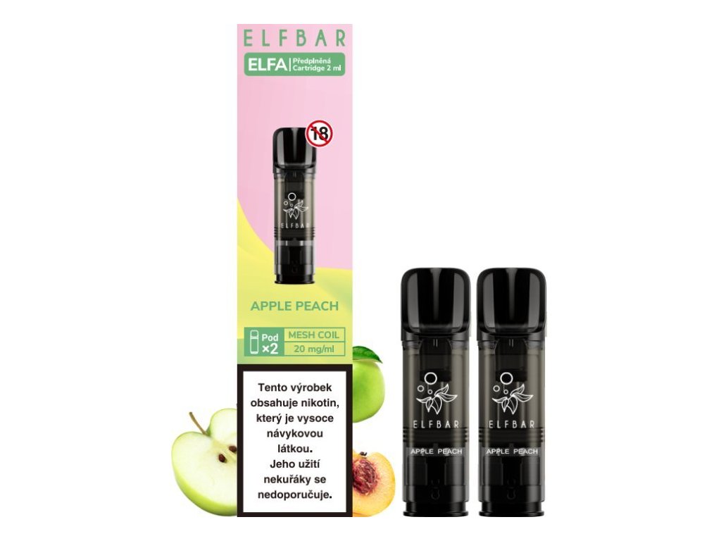 Vyvážený mix sladké broskve a jemně kyselého zeleného jablka... Předplněné cartridge Elf Bar ELFA obsahují 2ml liquidu o síle nikotinu 20mg. Cartridge obsahují prvotřídní liquid s nikotinovou solí, díky které dochází k rychlejší a kvalitnější vstřebatelnosti = bez dráždivého pocitu v krku oproti klasickým liquidům. Nedílnou součástí cartridge je spirálka Mesh pro rychlejší žhavení, rovnoměrné odpařování, vynikající chuť liquidu a větší tvorbu páry. Poměr 50VG/50PG