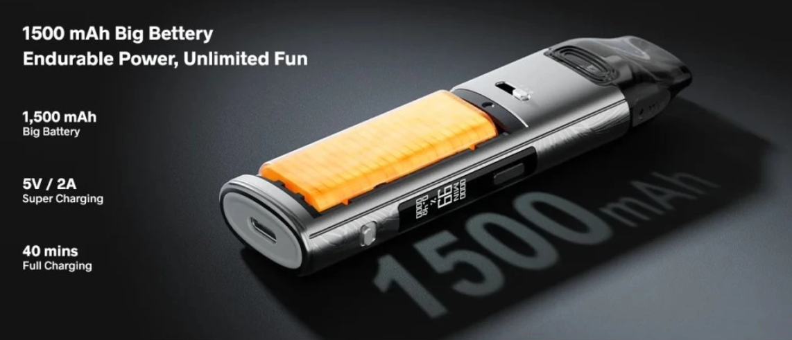 Integrovaná baterie s kapacitou 1500 mAh zajišťuje dostatek energie na celý den běžného vapování. Výkon lze nastavit v rozmezí 5-30 W, takže si každý uživatel najde optimální nastavení. Nabíjení probíhá přes USB-C port (5V/2A) a plné dobití trvá přibližně 40 minut. VooPoo VMATE Pro 2 podporuje automatickou aktivaci potahu bez nutnosti mačkání tlačítka, což zvyšuje pohodlí při používání.
