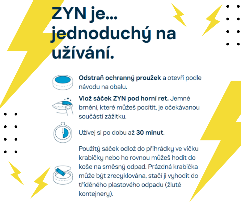 Nikotinový sáček pouze vyjmete z balení, vložíte do úst pod horní ret a během pár minut můžete očekávat jeho účinky. Sáček můžete používat až půl hodiny a poté ho můžete vložit do přihrádky na vrchu balení a nedělat si starosti s hledáním odpadkového koše. Každé balení obsahuje 20 sáčků.